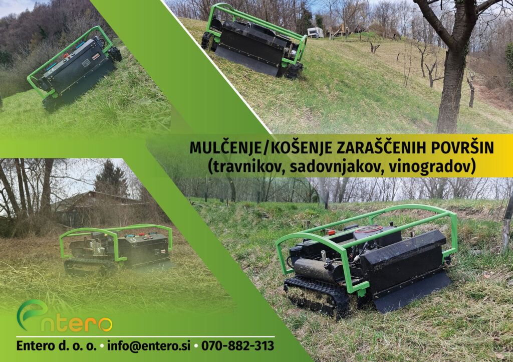 Pri podjetju Entero vam poleg prodaje prikolic in transportnih storitev nudimo tudi profesionalno storitev mulčenja in košnje zaraščenih površin. Uporabljamo zmogljivo opremo, s katero obdelamo travnike, sadovnjake, vinograde, pašnike, brežine in druge težje dostopne terene.